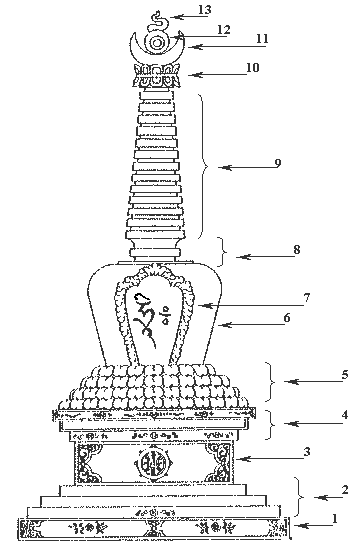 Ступа (тиб.: Чотэн ) 1. Фундамент - "Десять белых добродетелей": - Защита жизни живых существ - Милосердие - Нравственное поведение - Правдивость - Добронамеренность - Вежливость - Разумность (отсутствие пустословия и насмешки) - Умеренность, скромность - Сострадательность - Вера в истинность Учения