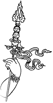 Трезубец (санскр. triśūla, тиб. rtse gsum pa, rtse gsum, mdung rtse gsum). Существуют различные толкования о символическом значении трезубца. Известно, что один из эпитетов Шивы – "Держащий в руке трезубец" (санскр. triśūlahasta, triśūlavarapāṇin). В регионе Гималаев и за его пределами бог Шива издревле почитался, как божественный покровитель йогинов. Вероятно, с йогической точки зрения, значение трезубца – символ трёх главных каналов в тонком теле человека. В буддизме имеются и другие трактовки: один из символов Трёх Драгоценностей – Будды, Дхармы и Сангхи; символ Просветления; знак Будды.